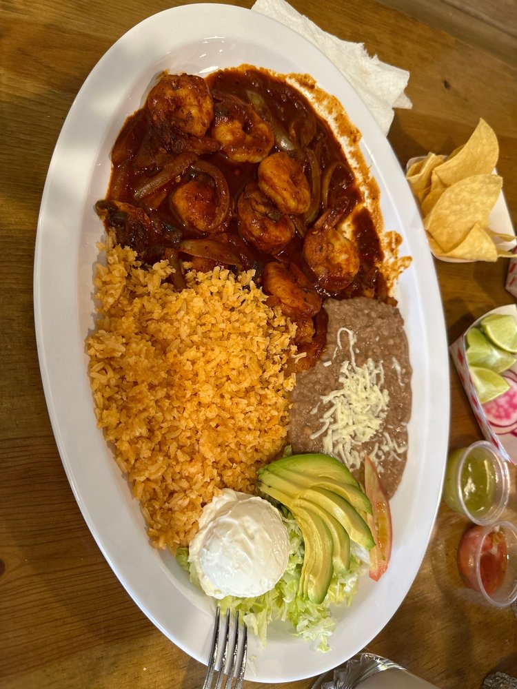 Todo a la plancha: cebolla, cilantro, jitomate y camarones Tortilla grande de harina con queso derretido, crema de origen. Guacamole, salsa y salsa chipotle. / All grilled: onions, cilantro, tomatoes and shrimp large flour tortilla with melted cheese, sour cream. Guacamole, sauce and chipotle sauce.