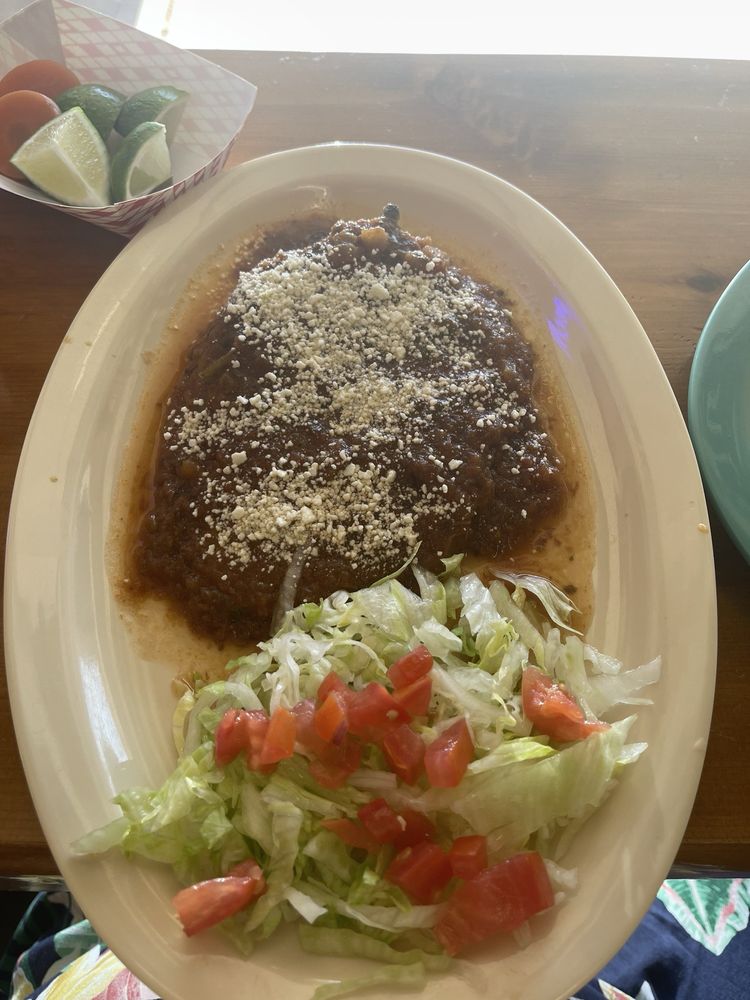 Carne deshebrada, queso, cebolla, salsa de cilantro y consom. / Shredded beef, cheese, onion, cilantro sauce and consom.