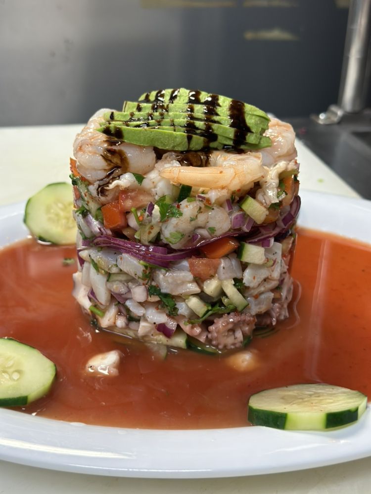 Sinaloense snack. Cooked shrimp , shrimp cured in lime juice,cooked octopus,cucumber,onions, avocado and salsa marisquera.